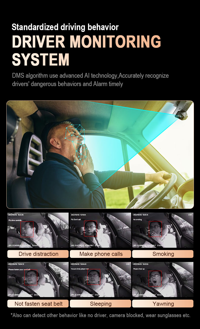 Smoking, making phone calls, yawning, dozing, distracted, driver not detected, blocking cameras, sunglasses identification, seat belts |